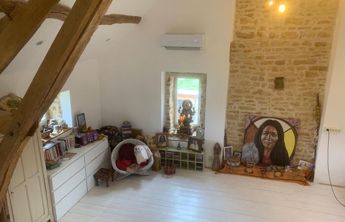 Réf 03-5167 Proche de LA CLAYETTE (71), située à la campagne, charmante maison en pierre de 228 m² environ, rénovée avec goût, comprenant au rez-de-chaussée: entrée sur tomettes, cuisine aménagée, salle à manger sur tomettes avec cheminée en pierre et poêle à bois, buanderie avec toilette, sauna avec douche, chambre avec salle de bain privative, carrelage pierre (chauffage au sol) boudoir. A l 'étage : 3 chambres, salle d 'eau avec wc, grand salon bibliothèque avec poutres apparentes. Pompe à chaleur de 2023, double vitrage, assainissement individuel aux normes. Petites dépendances attenantes, cave voutée, puits. Pour les amoureux de la nature : une jolie roulote de 12 m² dispose d' un coin repas avec couchage, salle d 'eau, wc (relié à la fosse septique). Beau terrain arboré de 2750m2, avec murets en pierre et vue sur les bocages. Piscine hors-sol (8m x 4m x 1,20m) filtre à sable. Classe énergie E. Plus d 'informations au 06 74 34 69 95.