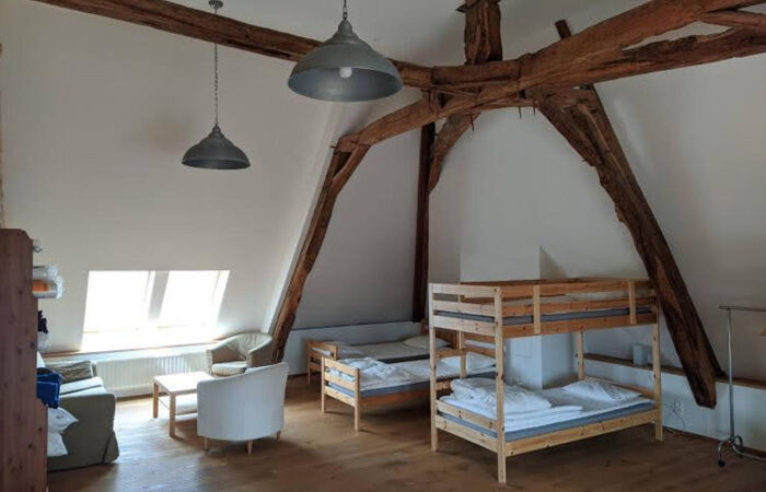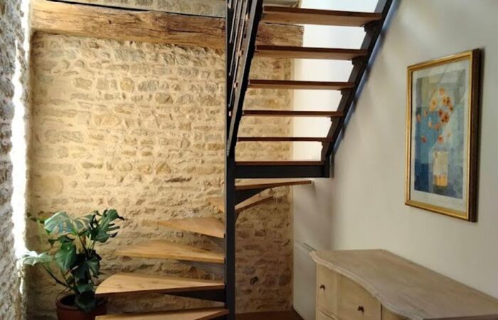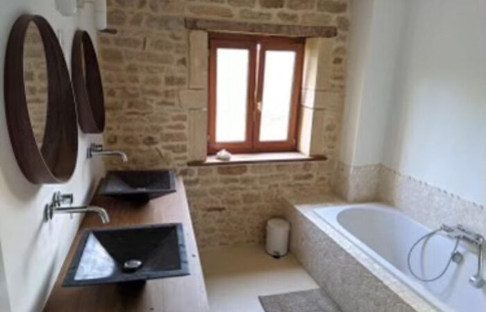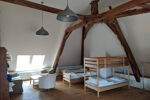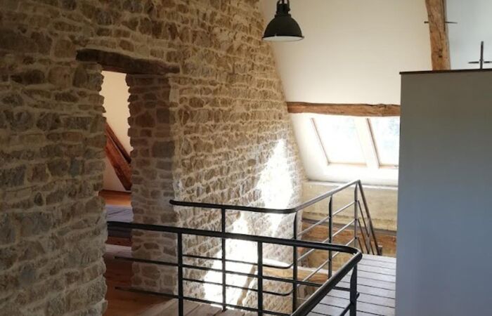 salle de bain avec douche, wc séparé. Au-dessus: un dortoir avec petit salon cosy, poutres apparentes, parquet en chêne, salle de bain avec douche, wc séparé.