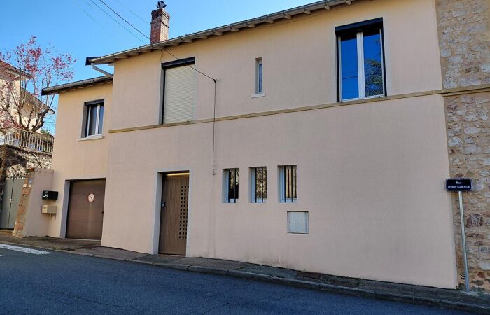 Réf 03-5201. EXCLUSIVITÉ. COURS LA VILLE centre, maison de ville sur sous-sol comprenant à l'étage : cuisine, séjour, salon (pourrait être aménagé en petite chambre), chambre, salle d'eau et wc séparé. Au sous-sol : garage avec porte électrique, chaufferie et cave. Toiture en bon état. Chauffage central au gaz de ville. Double vitrage. Volets roulants électriques et volets bois. Terrain clos. A proximité des écoles et des commerces. Classe énergie : F. Plus d'informations au 06-85-29-73-39.